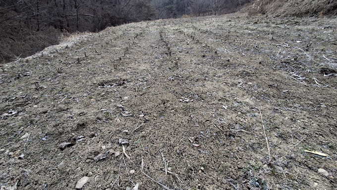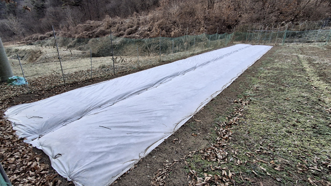 남편이 야무지게도 덮어 놓은 마늘밭.